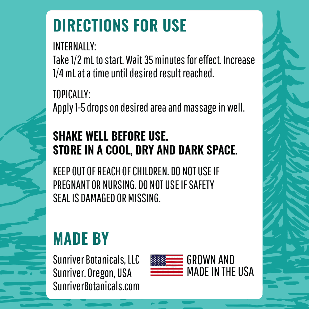 Unflavored, smooth- and mild-tasting, Sunriver Botanicals CBD oil tincture is non-intoxicating and chemical-free. Our US-grown hemp products are designed to complement your wellness routine, offering a natural option for those seeking to enhance their daily comfort and well-being. It’s crafted to provide a sense of relief and support, making it an ideal choice for individuals looking to maintain their wellness naturally. Our extracts are lab tested for purity and quality and contain nothing artificial. Read more…